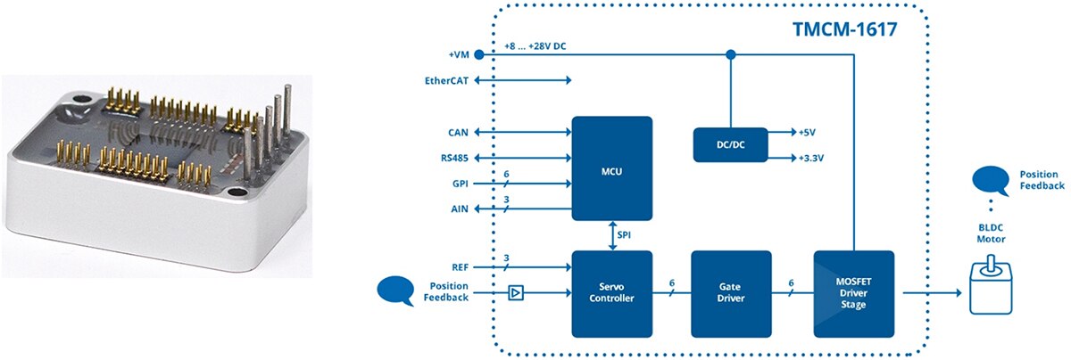 Figure 2: The lightweight and compact TMCM-1617 servo drive provides a complete 8 V to 24 V, 18 A BLDC motor control. (Image source: Analog Devices Inc.)
