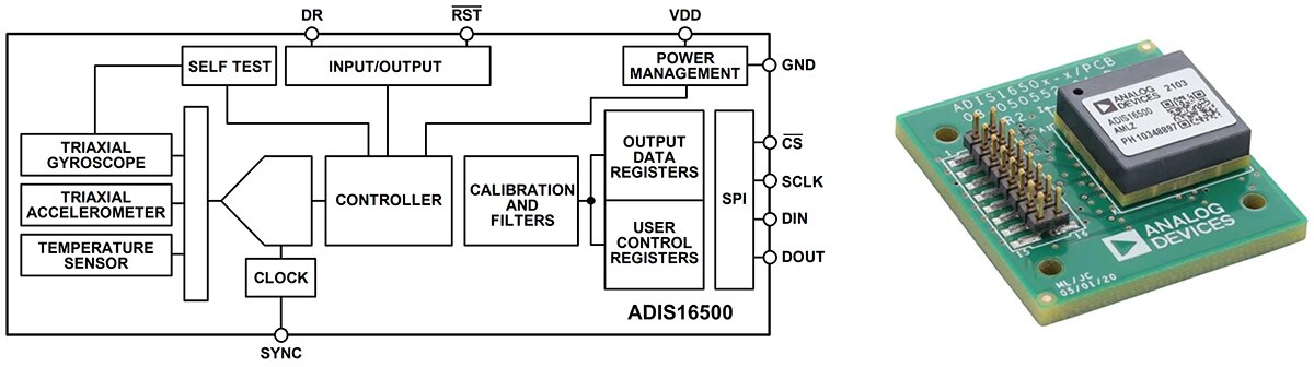 Figure 5: The high-level block diagram of the ADIS16500 (left) only hints at the internal integration and sophistication of this 6-DoF IMU; the associated ADIS16500/PCBZ breakout board (right) serves primarily as a physical-connection interface to the EVAL-ADIS2Z evaluation system. (Image source: Analog Devices Inc.)