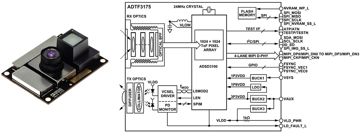 To minimize these difficulties, Analog Devices offers the ADTF3175 ToF module (Figure 3). This complete unit features a 1 megapixel (MP) CMOS indirect ToF imager. It also integrates a lens and a 940 nm optical band-pass filter for the imager, an infrared-illumination source containing optics, a laser diode, a laser-diode driver and photodetector, flash memory, and power regulators to generate local supply voltages.