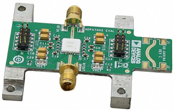 평가 기판 ADPA7005-EVALZ는 2층 인쇄 회로 기판(PCB)으로 구성되며 10mil 두께의 Rogers 4350B 구리 피복을 알루미늄 방열판에 실장하여 제작합니다. 방열판은 장치에 열 완화를 제공하고 PCB에 기계적 지원을 제공합니다. 방열판에 있는 구멍을 통해 더 큰 방열판에 부착할 수 있으므로 열 관리를 개선할 수 있습니다. ADPA7005-EVALZ의 RFIN 및 RFOUT 포트는 2.9mm 암 동축 커넥터로 채워집니다. 각 RF 트레이스는 50Ω 특성 임피던스를 갖습니다. 2개의 8핀 헤더를 통해 전원 전압, 접지 전압, 게이트 제어 전압 및 감지기 출력 전압에 액세스할 수 있습니다.
