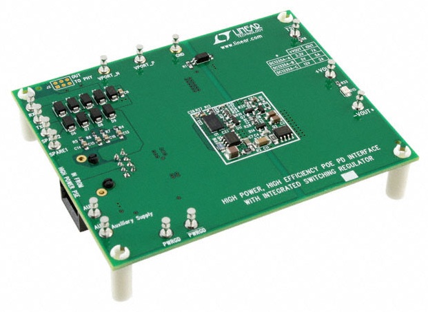 Demonstration circuit 1335B-C is a high-power supply featuring the LTC®4269IDKD-1. This board acts as an IEEE 802.3at compliant, high power Power-over-Ethernet (PoE), Powered Device (PD) and connects at the RJ45 to a compatible high power Power Sourcing Equipment (PSE) device, such as the DC1366.